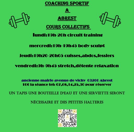 Les cours collectifs se tiendront dans la salle de l'ancienne mairie, le lundi, mercredi et jeudi à partir de 19h et le vendredi à 9h.